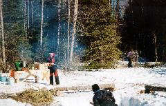 The picnic site. The only thing left to do is cut some sticks for cooking hot dogs over the fire. Pay particular attention to the table - constructed using only a cordless drill and a chain saw! We even made benches to sit on.