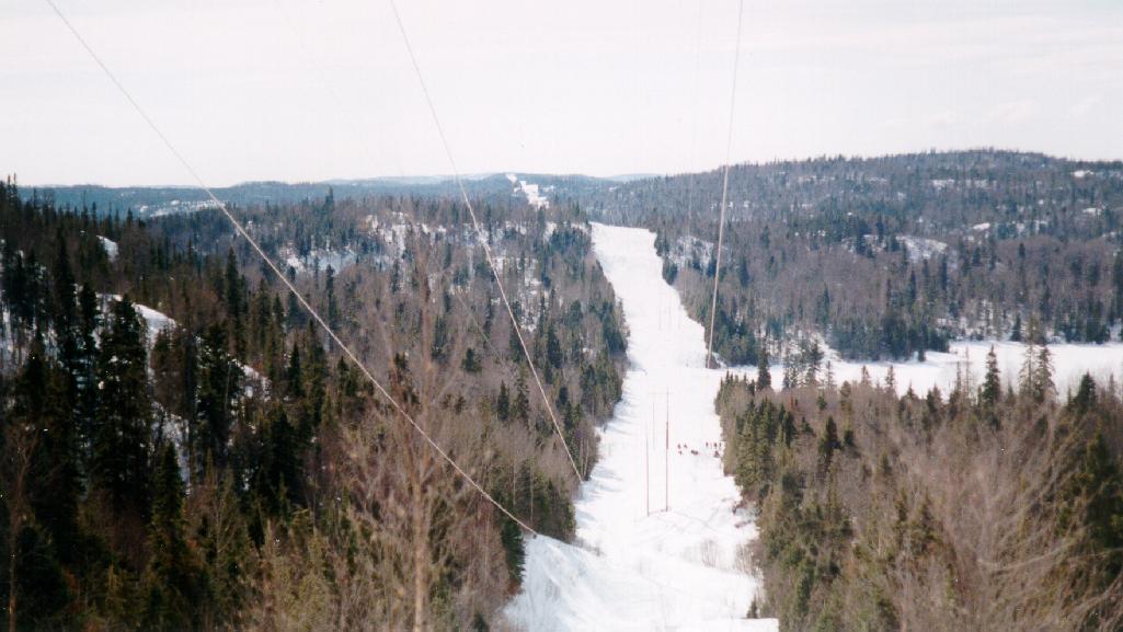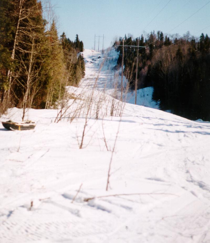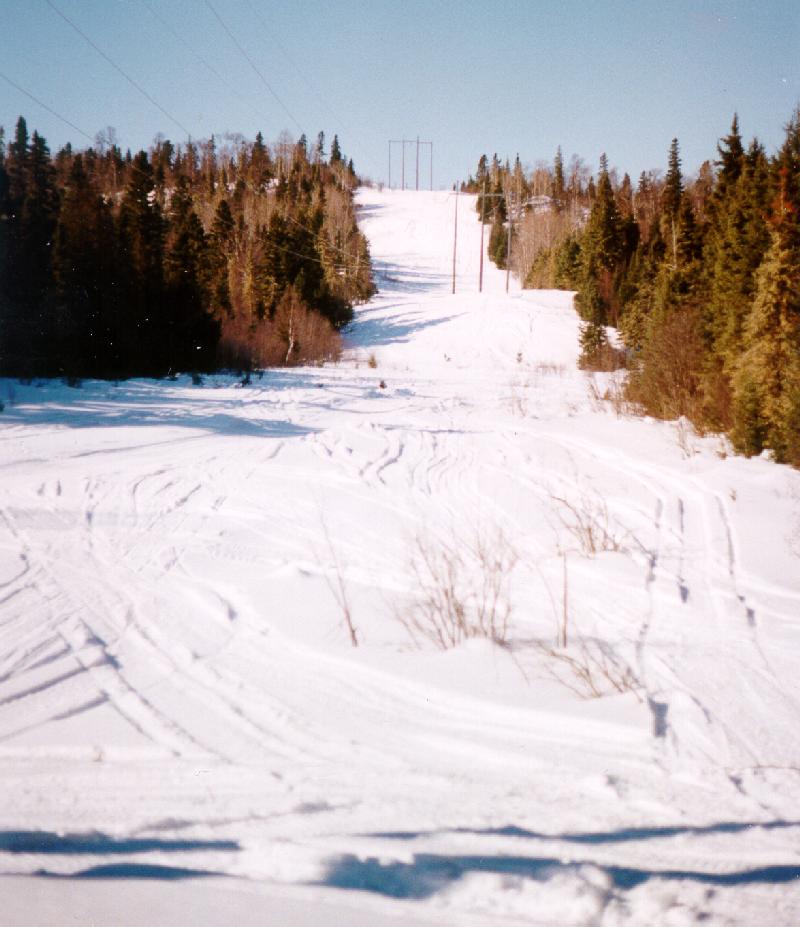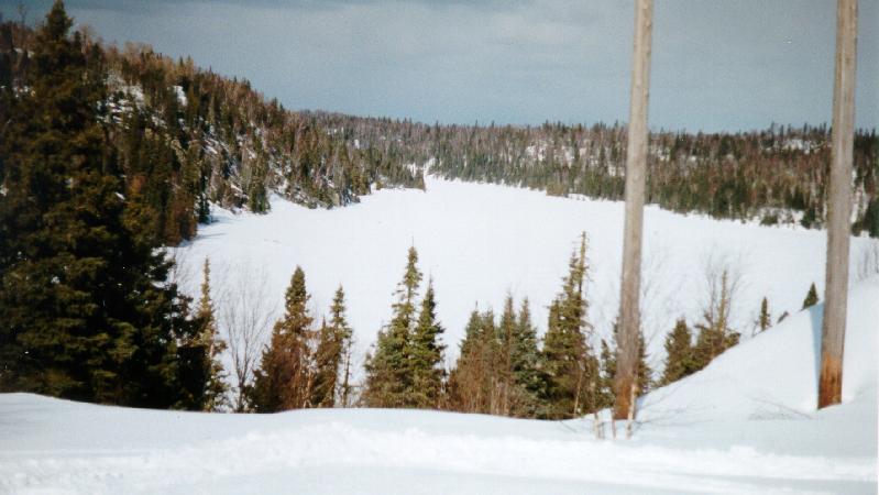 The above picture was taken just a little to the east of south end of Goodchild Lake looking to the west. The D110A trail south to Marathon turns to the left at the first set of power poles. Goodchild Lake starts just to the right of the trees at the bottom the the hill.