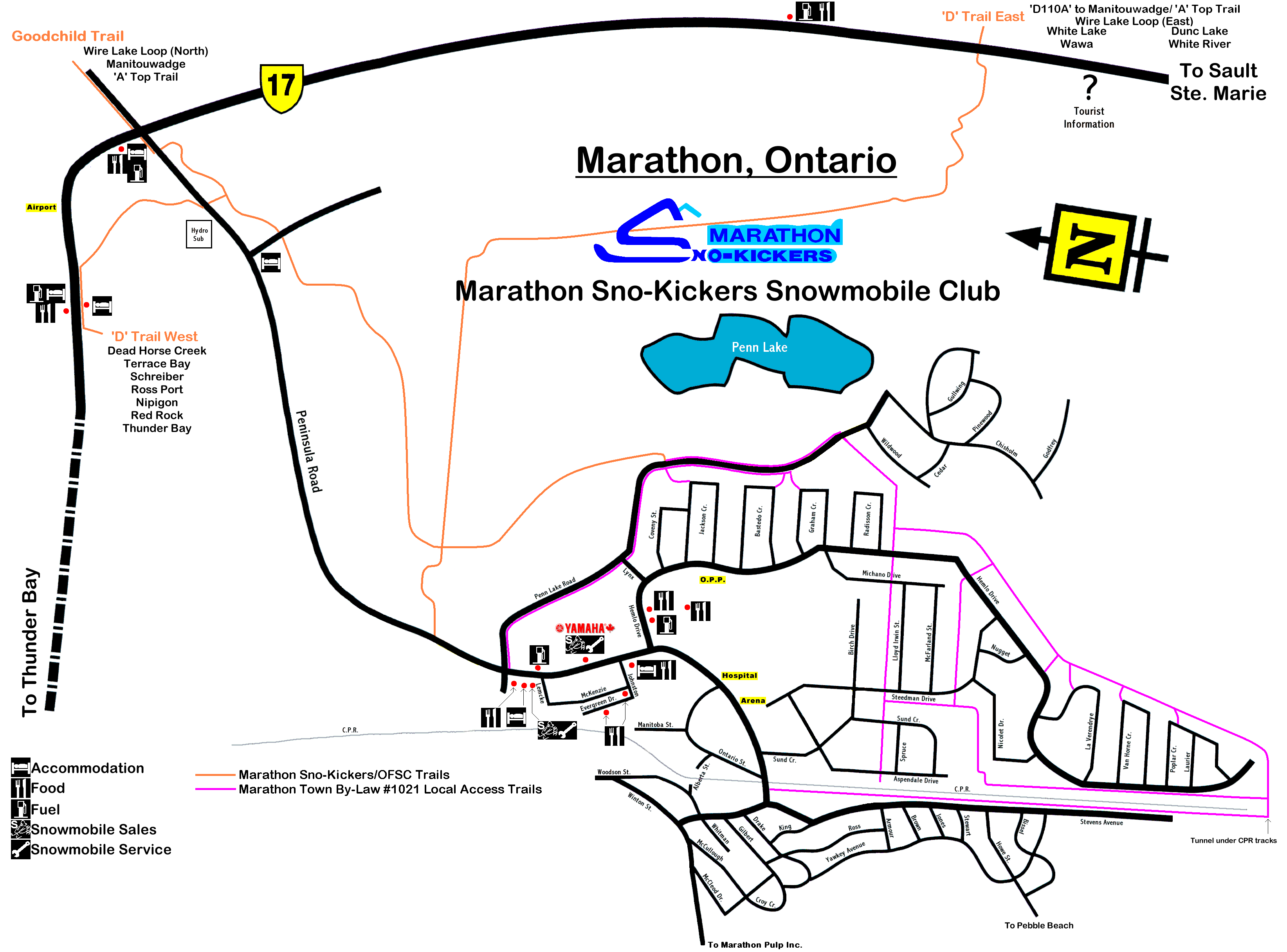 The local map shows the trail system in the town of Marathon, including the town by-law access routes. The OFSC/Sno-Kickers trail is shown in orange. Town by-law local access trails are shown in purple. The map is 3288 x 2433 pixels. File size is 338,303 bytes. Local services and accommodations are shown on the map.