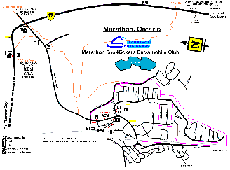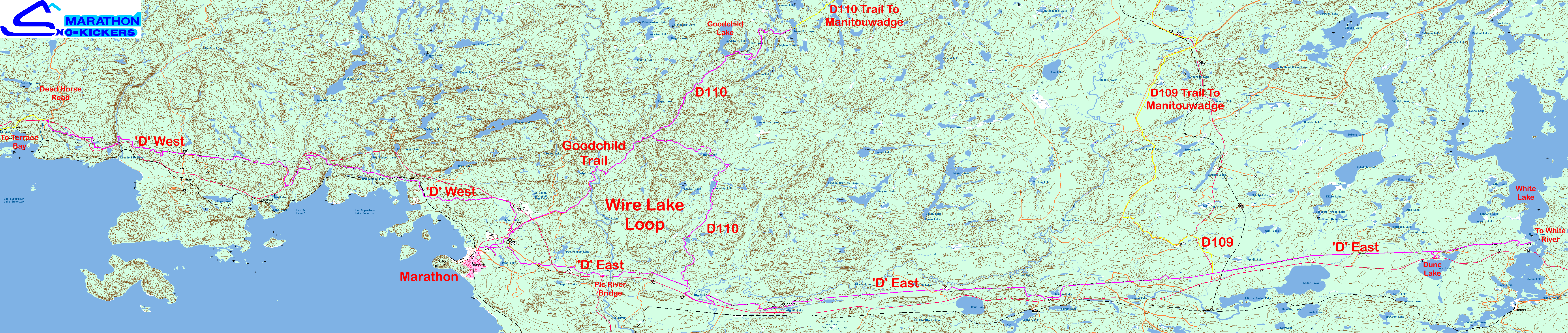 The following map is a 3D rendering of the west, central, and north portions of the Marathon Sno-Kicker's trail system. Click on the image to get the full map. The full map is 3,201x714 pixels. File size is 1,194,229 bytes. The map was reduced to 256 colors, otherwise the file size would be 5.6MB. This map shows the OFSC Top 'D' trail west of Marathon to Dead Horse Road, the D110A trail north to Runnalls Lake, the Goodchild Trail, and the OFSC Top 'D' trail to the east of Marathon a little past the Black River. The trails are shown in yellow. Updated for the 2006 season.