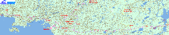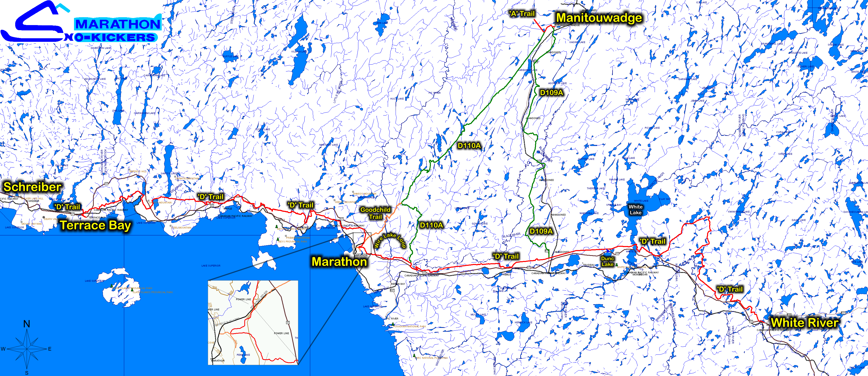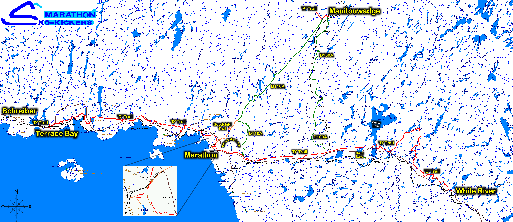 The next two maps cover the trails from Terrace Bay west of Marathon to White River to the east of Marathon, and Manitouwadge to the North East of Marathon. Click on the map image to get the full map. It is 3,425x1,484 pixels and weights in at 844,592 bytes. This map last updated September 2006.