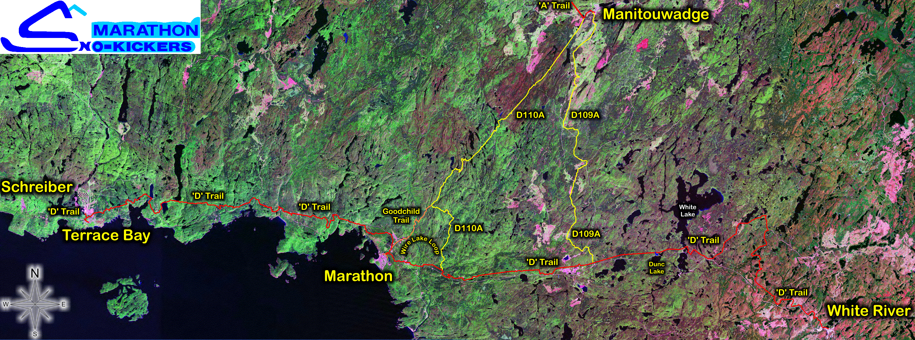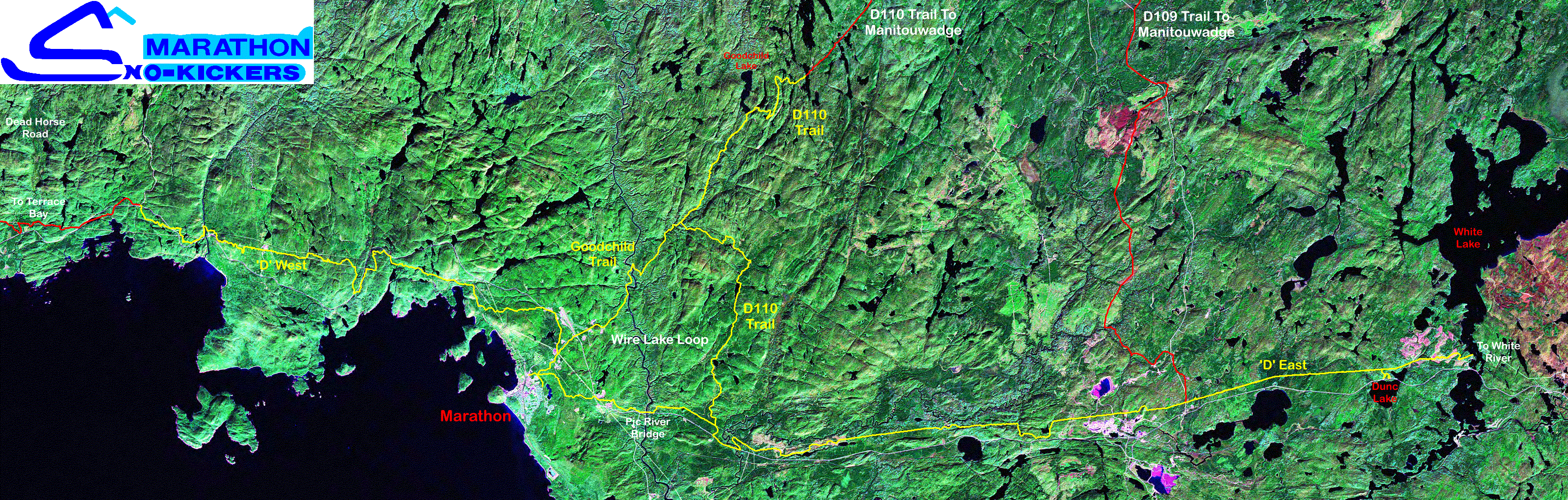 Click on the image below to see a map of the Marathon Sno-Kickers trail system on a composite satellite image. The full map is 3197x1022pixels. File size is 2,016,717 bytes. Each pixel is 14.25 Meters. Marathon's trails are marked in yellow. Neighboring club trails are in red. D109 trail added for the 2006 season.